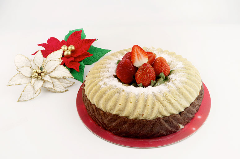 Buka kue dari cetakan lalu hias dengan buah strawberry dan taburi dengan BOLA Deli Gula Halus
