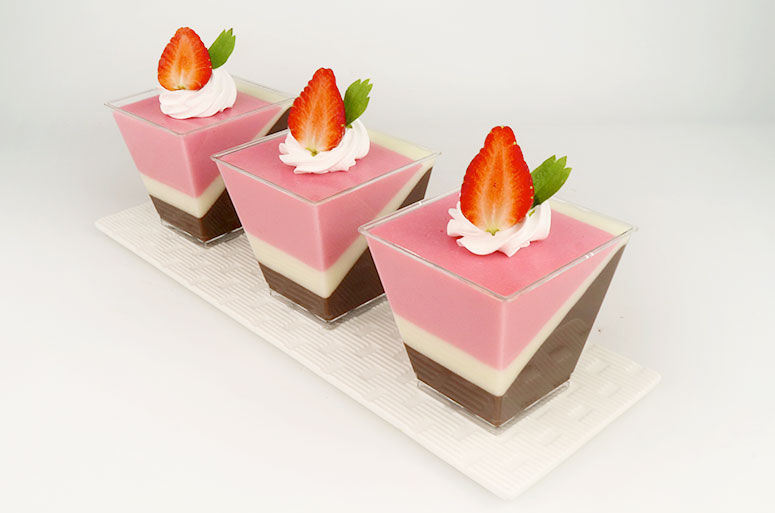 Tuang pudding dalam box mika yang posisinya miring 45 derajat, biarkan hingga set