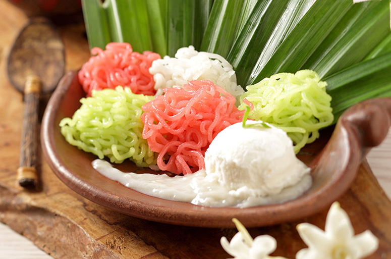 Bagi Anda yang lebih menyukai sajian Putu Mayang versi original, bisa menggunakan kuah santan untuk menggantikan saus durian.